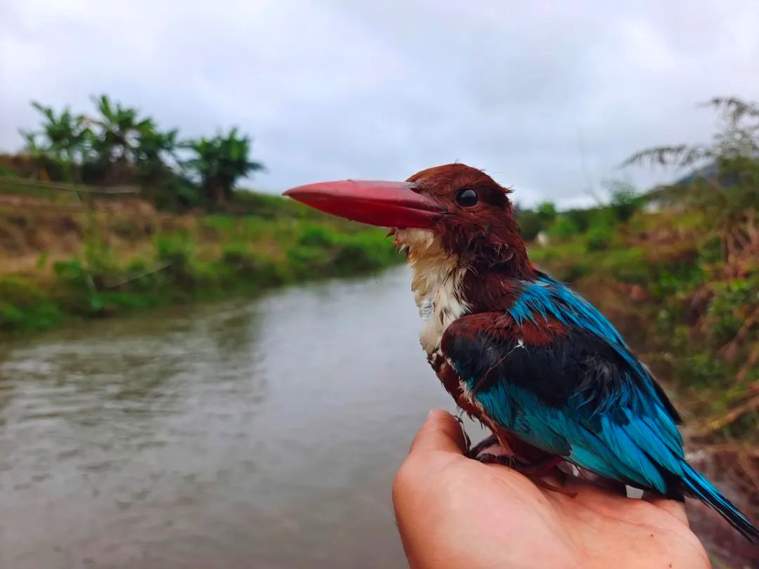 On October 26, two white-throated kingfishers were seen in the river where one of them had been soaked and stuck in the bitter cold water. A youngster jumped into the river without hesitation. Thus the white-throated kingfishers were saved. This happened near the Innovation Park of Dongsa Group in Heping Village, Mengxian Town, Ning’er County, Pu’er City.