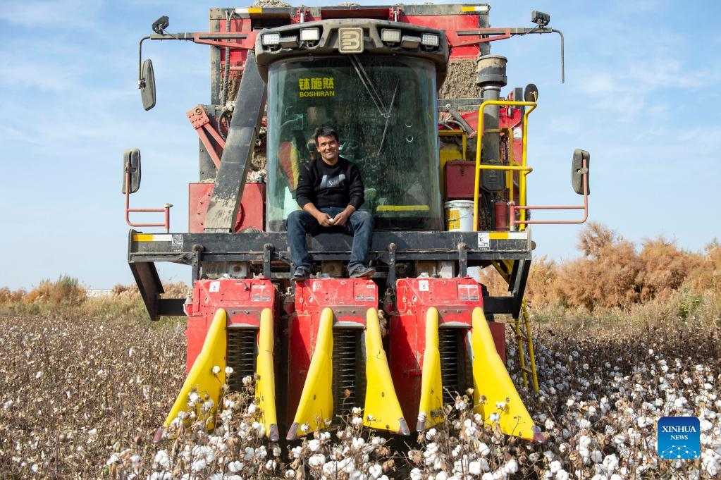 Amar Aziz poses on his cotton picker in a cotton field in Toyboldi Town of Xayar County, Aksu Prefecture, northwest China's Xinjiang Uygur Autonomous Region, Oct. 27, 2021. Amar Aziz lives in Xayar County, Aksu Prefecture, which is an important cotton-producing area in Xinjiang. His family has been planting cotton for more than 20 years. In the early years, cotton planting and picking mainly depended on manpower. In the cotton picking season, with more than a dozen pickers hired, it would take them three months to finish the work in 300 mu (20 hectares) of cotton fields. Nowadays, with the popularization of mechanization, the efficiency and income have been significantly improved. In 2020, Amar Aziz bought a cotton picker with a loan, and bought another one in partnership with friends. "Now most people will choose mechanical cotton picking," Amar Aziz said. Appointment for his cotton picking service has been scheduled for two weeks. In order to improve harvesting efficiency, he hired four drivers for each machine. Excluding the costs of fuel, maintenance and staff salaries, Amar Aziz estimates that his two cotton pickers can harvest about 8,000 mu (533 hectares) of cotton and earn him 800,000 yuan (125,040 dollars) this year. (Xinhua/Ma Kai)