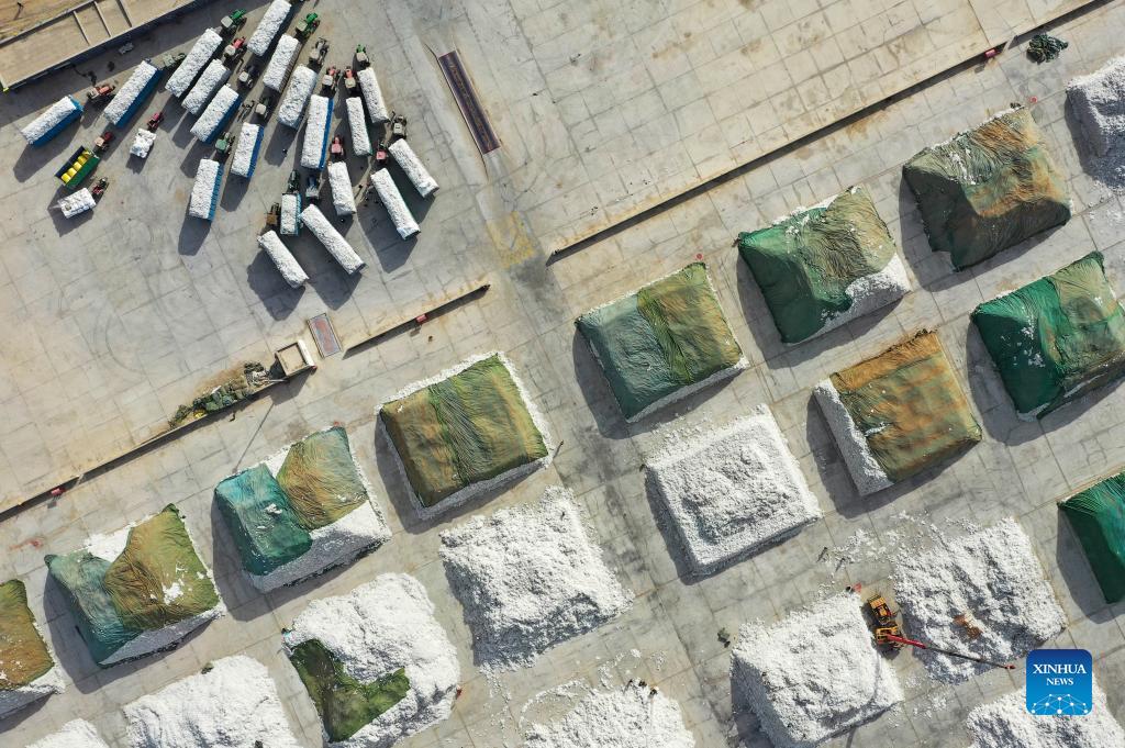 Aerial photo shows cotton in a ginnery in Gezkum Town of Xayar County, Aksu Prefecture, northwest China's Xinjiang Uygur Autonomous Region, Oct. 26, 2021. Amar Aziz lives in Xayar County, Aksu Prefecture, which is an important cotton-producing area in Xinjiang. His family has been planting cotton for more than 20 years. In the early years, cotton planting and picking mainly depended on manpower. In the cotton picking season, with more than a dozen pickers hired, it would take them three months to finish the work in 300 mu (20 hectares) of cotton fields. Nowadays, with the popularization of mechanization, the efficiency and income have been significantly improved. In 2020, Amar Aziz bought a cotton picker with a loan, and bought another one in partnership with friends. "Now most people will choose mechanical cotton picking," Amar Aziz said. Appointment for his cotton picking service has been scheduled for two weeks. In order to improve harvesting efficiency, he hired four drivers for each machine. Excluding the costs of fuel, maintenance and staff salaries, Amar Aziz estimates that his two cotton pickers can harvest about 8,000 mu (533 hectares) of cotton and earn him 800,000 yuan (125,040 dollars) this year. (Xinhua/Ma Kai)