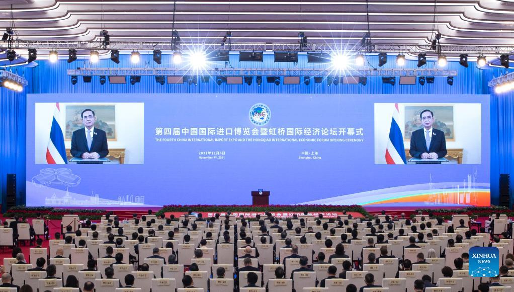 Thai Prime Minister Prayut Chan-o-cha speaks via video at the opening ceremony of the fourth China International Import Expo held in east China's Shanghai, Nov. 4, 2021. (Xinhua/Jin Liwang)