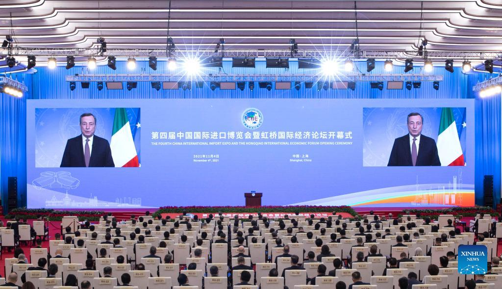 Italy's Prime Minister Mario Draghi speaks via video at the opening ceremony of the fourth China International Import Expo held in east China's Shanghai, Nov. 4, 2021. (Xinhua/Jin Liwang)