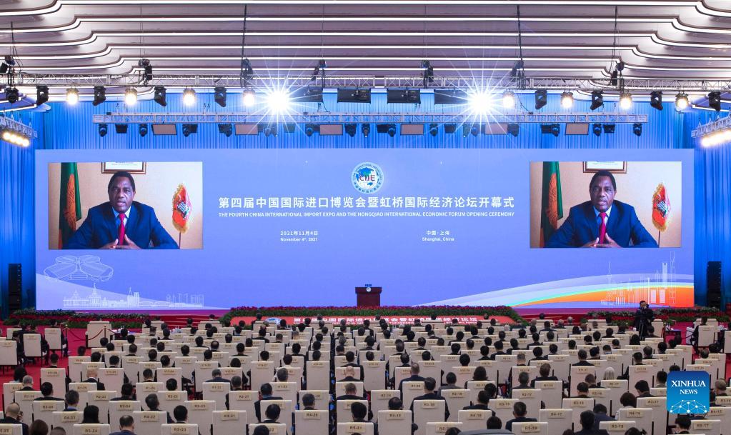 Zambian President Hakainde Hichilema speaks via video at the opening ceremony of the fourth China International Import Expo held in east China's Shanghai, Nov. 4, 2021. (Xinhua/Jin Liwang)