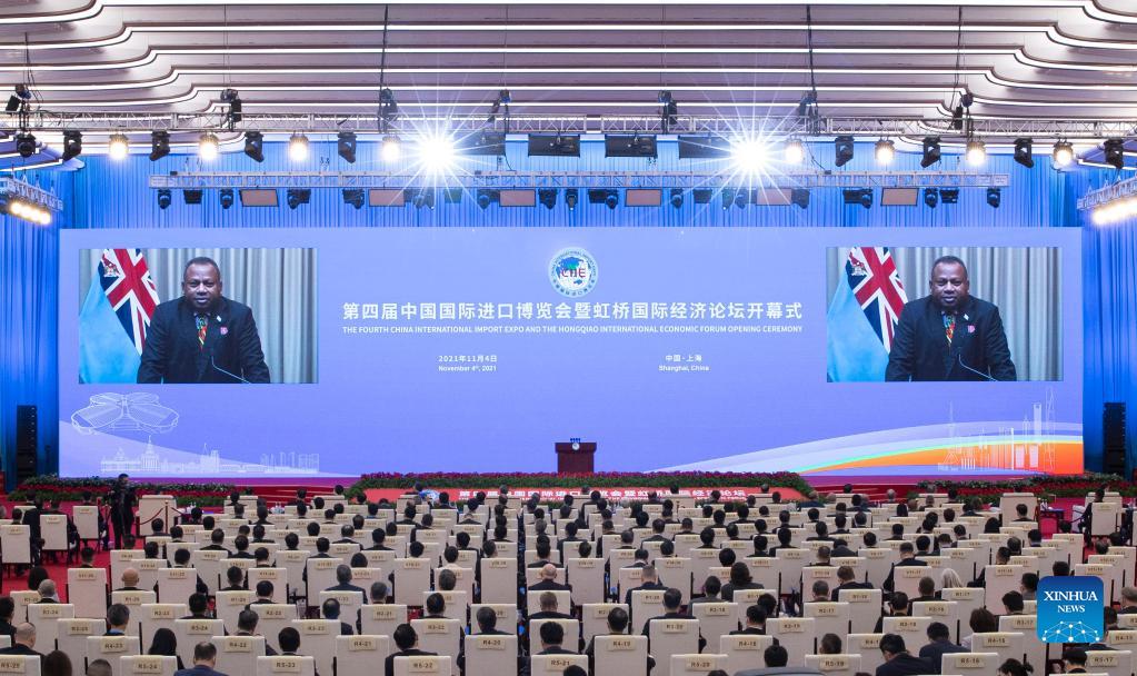 Fiji's Acting Prime Minister Inia Batikoto Seruiratu speaks via video at the opening ceremony of the fourth China International Import Expo held in east China's Shanghai, Nov. 4, 2021. (Xinhua/Jin Liwang)