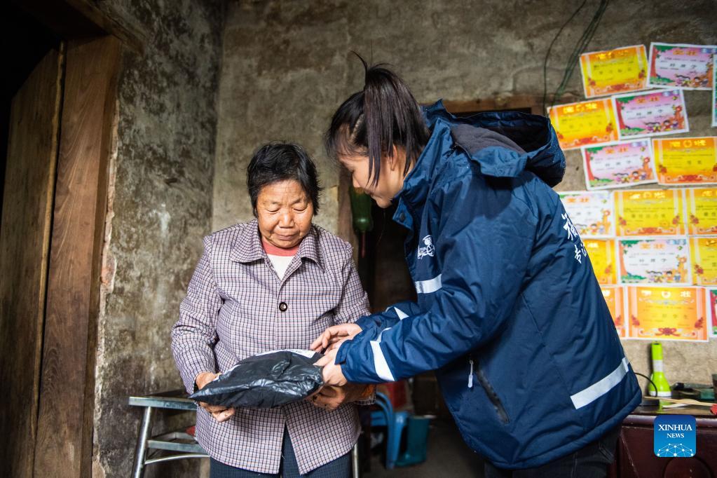 Hu Xia (R) delivers package in Jinping Village of Huangshi Town in Leiyang, central China's Hunan Province, Nov. 3, 2021. Hu Xia is a post-90s deliverywoman providing delivery service for four villages in Huangshi Town. Over the past seven years, the number of local rural delivery orders has increased from less than 10 per day to more than 200 now. In addition to delivering packages, Hu also helps villagers sell bamboo shoots, eggs and other agricultural specialties through online store. Her delivery station has become one of the most lively places in village. In the January-August period, the delivery industry handled over 28 billion parcels in rural areas, a jump of more than 30 percent from a year earlier, according to the State Post Bureau. (Xinhua/Chen Sihan)