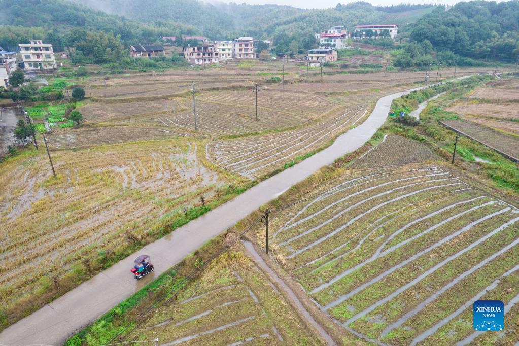 Aerial photo shows Hu Xia riding to deliver packages in Jinping Village of Huangshi Town in Leiyang, central China's Hunan Province, Nov. 3, 2021. Hu Xia is a post-90s deliverywoman providing delivery service for four villages in Huangshi Town. Over the past seven years, the number of local rural delivery orders has increased from less than 10 per day to more than 200 now. In addition to delivering packages, Hu also helps villagers sell bamboo shoots, eggs and other agricultural specialties through online store. Her delivery station has become one of the most lively places in village. In the January-August period, the delivery industry handled over 28 billion parcels in rural areas, a jump of more than 30 percent from a year earlier, according to the State Post Bureau. (Xinhua/Chen Sihan)