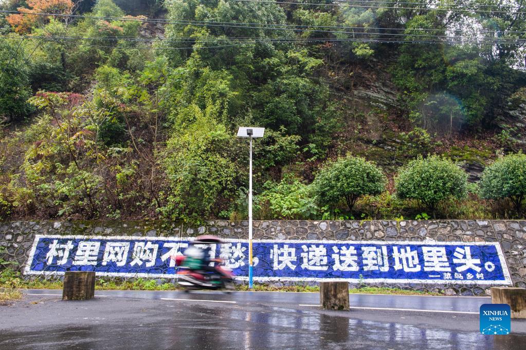 Hu Xia is on her way to deliver packages in Shishi Village of Huangshi Town in Leiyang, central China's Hunan Province, Nov. 3, 2021. Hu Xia is a post-90s deliverywoman providing delivery service for four villages in Huangshi Town. Over the past seven years, the number of local rural delivery orders has increased from less than 10 per day to more than 200 now. In addition to delivering packages, Hu also helps villagers sell bamboo shoots, eggs and other agricultural specialties through online store. Her delivery station has become one of the most lively places in village. In the January-August period, the delivery industry handled over 28 billion parcels in rural areas, a jump of more than 30 percent from a year earlier, according to the State Post Bureau. (Xinhua/Chen Sihan)
