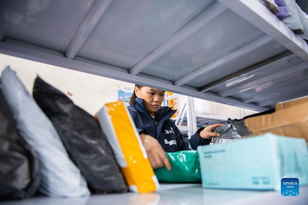 Hu Xia arranges packages in a rural delivery station in Huangshi Town in Leiyang, central China's Hunan Province, Nov. 3, 2021. Hu Xia is a post-90s deliverywoman providing delivery service for four villages in Huangshi Town. Over the past seven years, the number of local rural delivery orders has increased from less than 10 per day to more than 200 now. In addition to delivering packages, Hu also helps villagers sell bamboo shoots, eggs and other agricultural specialties through online store. Her delivery station has become one of the most lively places in village. In the January-August period, the delivery industry handled over 28 billion parcels in rural areas, a jump of more than 30 percent from a year earlier, according to the State Post Bureau. (Xinhua/Chen Sihan)