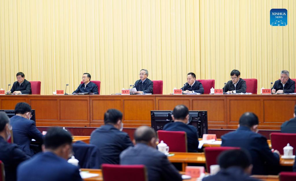 Chinese Vice Premier Hu Chunhua, also a member of the Political Bureau of the Communist Party of China Central Committee, attends a teleconference on the construction of farmland water conservancy facilities and the high-standard development of farmlands and delivers a speech in Beijing, capital of China, Nov. 4, 2021. (Xinhua/Yin Bogu)