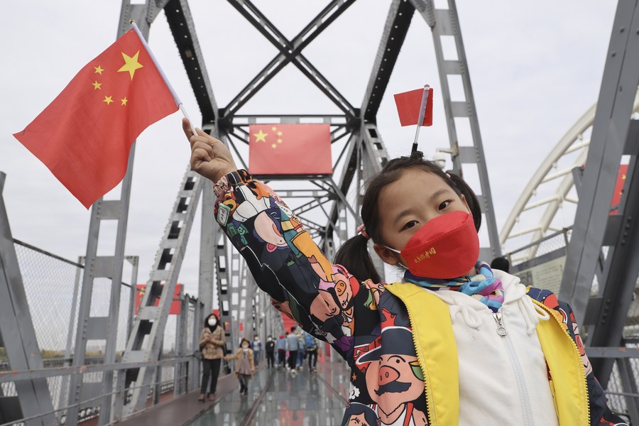 A child waves the Chinese national flag while posing for photos on a bridge in Harbin, northeast China's Heilongjiang Province, Oct. 2, 2021. (Xinhua/Zhang Tao)