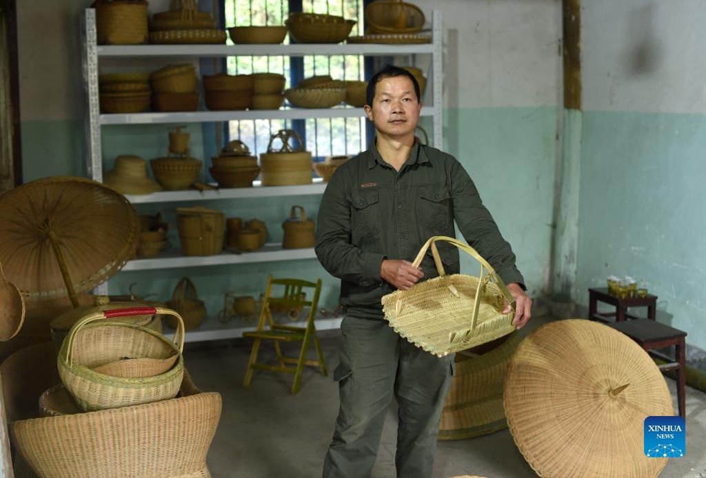 Pan Yunfeng displays a bamboo product he made at Hengling Village in Lin'an District of Hangzhou, east China's Zhejiang Province, Nov. 2, 2021. A bamboo weaver in Hangzhou has amazed netizens after short videos of him turning thick bamboo into delicate slices were uploaded on social media platforms including TikTok. Pan Yunfeng, 51, makes pot brush, baskets, umbrellas and even bathtubs out of bamboo on TikTok. He started learning bamboo weaving at an early age and began to publish his works in 2019. With over 4.5 million followers on Douyin (the Chinese version of TikTok) and the most popular video garnering about 2 million likes, Pan has become a genuine influencer for netizens by promoting the traditional art simply using his own bare hands. Carrying a history of 2,000 years, bamboo weaving art was listed as a national intangible cultural heritage in 2008. "Bamboo weaving has become an integral part of my life. I will work my best to preserve and pass on the craft," Pan said. (Xinhua/Han Chuanhao)