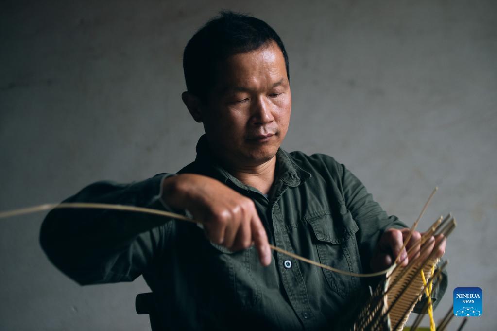Pan Yunfeng makes a bamboo product at Hengling Village in Lin'an District of Hangzhou, east China's Zhejiang Province, Nov. 2, 2021. A bamboo weaver in Hangzhou has amazed netizens after short videos of him turning thick bamboo into delicate slices were uploaded on social media platforms including TikTok. Pan Yunfeng, 51, makes pot brush, baskets, umbrellas and even bathtubs out of bamboo on TikTok. He started learning bamboo weaving at an early age and began to publish his works in 2019. With over 4.5 million followers on Douyin (the Chinese version of TikTok) and the most popular video garnering about 2 million likes, Pan has become a genuine influencer for netizens by promoting the traditional art simply using his own bare hands. Carrying a history of 2,000 years, bamboo weaving art was listed as a national intangible cultural heritage in 2008. "Bamboo weaving has become an integral part of my life. I will work my best to preserve and pass on the craft," Pan said. (Xinhua/Jiang Han)
