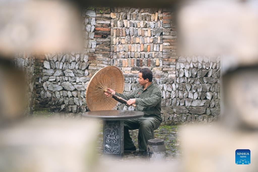Pan Yunfeng makes a bamboo umbrella at Hengling Village in Lin'an District of Hangzhou, east China's Zhejiang Province, Nov. 2, 2021. A bamboo weaver in Hangzhou has amazed netizens after short videos of him turning thick bamboo into delicate slices were uploaded on social media platforms including TikTok. Pan Yunfeng, 51, makes pot brush, baskets, umbrellas and even bathtubs out of bamboo on TikTok. He started learning bamboo weaving at an early age and began to publish his works in 2019. With over 4.5 million followers on Douyin (the Chinese version of TikTok) and the most popular video garnering about 2 million likes, Pan has become a genuine influencer for netizens by promoting the traditional art simply using his own bare hands. Carrying a history of 2,000 years, bamboo weaving art was listed as a national intangible cultural heritage in 2008. "Bamboo weaving has become an integral part of my life. I will work my best to preserve and pass on the craft," Pan said. (Xinhua/Jiang Han)