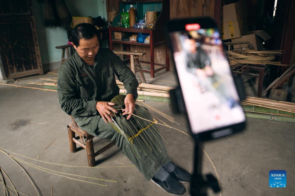Pan Yunfeng shoots a video of him making a bamboo product at Hengling Village in Lin'an District of Hangzhou, east China's Zhejiang Province, Nov. 2, 2021. A bamboo weaver in Hangzhou has amazed netizens after short videos of him turning thick bamboo into delicate slices were uploaded on social media platforms including TikTok. Pan Yunfeng, 51, makes pot brush, baskets, umbrellas and even bathtubs out of bamboo on TikTok. He started learning bamboo weaving at an early age and began to publish his works in 2019. With over 4.5 million followers on Douyin (the Chinese version of TikTok) and the most popular video garnering about 2 million likes, Pan has become a genuine influencer for netizens by promoting the traditional art simply using his own bare hands. Carrying a history of 2,000 years, bamboo weaving art was listed as a national intangible cultural heritage in 2008. "Bamboo weaving has become an integral part of my life. I will work my best to preserve and pass on the craft," Pan said. (Xinhua/Jiang Han)