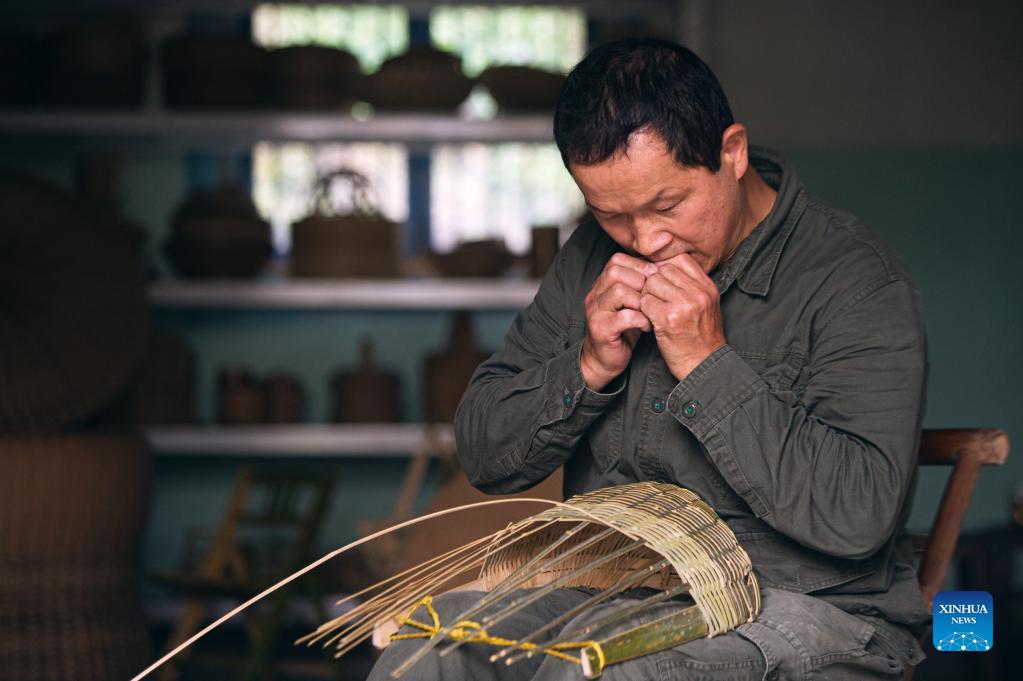 Pan Yunfeng sucks his finger that was pricked by a bamboo splinter while making a bamboo product at Hengling Village in Lin'an District of Hangzhou, east China's Zhejiang Province, Nov. 2, 2021. A bamboo weaver in Hangzhou has amazed netizens after short videos of him turning thick bamboo into delicate slices were uploaded on social media platforms including TikTok. Pan Yunfeng, 51, makes pot brush, baskets, umbrellas and even bathtubs out of bamboo on TikTok. He started learning bamboo weaving at an early age and began to publish his works in 2019. With over 4.5 million followers on Douyin (the Chinese version of TikTok) and the most popular video garnering about 2 million likes, Pan has become a genuine influencer for netizens by promoting the traditional art simply using his own bare hands. Carrying a history of 2,000 years, bamboo weaving art was listed as a national intangible cultural heritage in 2008. "Bamboo weaving has become an integral part of my life. I will work my best to preserve and pass on the craft," Pan said. (Xinhua/Jiang Han)