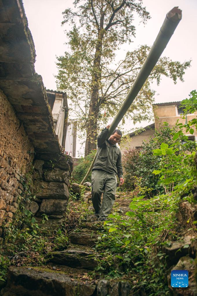 Pan Yunfeng carries a bamboo pole home at Hengling Village in Lin'an District of Hangzhou, east China's Zhejiang Province, Nov. 2, 2021. A bamboo weaver in Hangzhou has amazed netizens after short videos of him turning thick bamboo into delicate slices were uploaded on social media platforms including TikTok. Pan Yunfeng, 51, makes pot brush, baskets, umbrellas and even bathtubs out of bamboo on TikTok. He started learning bamboo weaving at an early age and began to publish his works in 2019. With over 4.5 million followers on Douyin (the Chinese version of TikTok) and the most popular video garnering about 2 million likes, Pan has become a genuine influencer for netizens by promoting the traditional art simply using his own bare hands. Carrying a history of 2,000 years, bamboo weaving art was listed as a national intangible cultural heritage in 2008. "Bamboo weaving has become an integral part of my life. I will work my best to preserve and pass on the craft," Pan said. (Xinhua/Jiang Han)