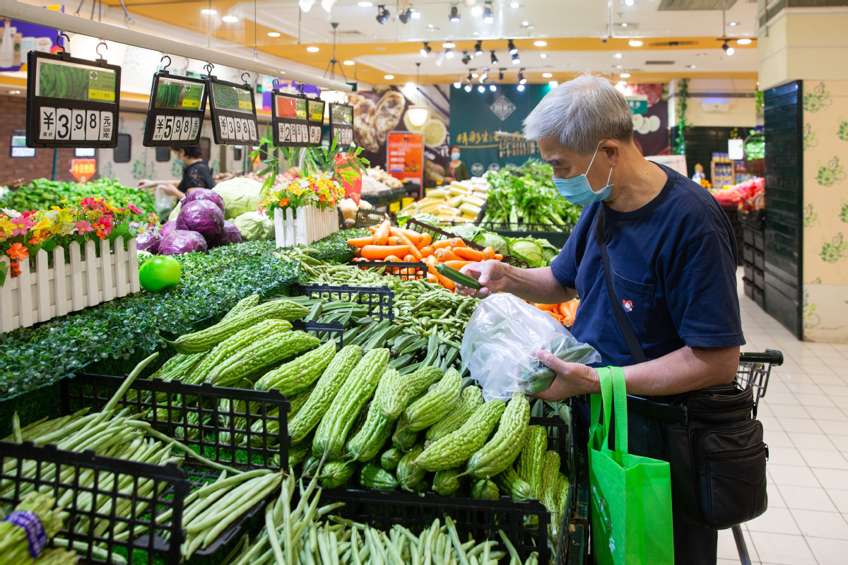 A shopper buys vegetables at a supermarket in Nanjing, Jiangsu province. (Photo by SU YANG/FOR CHINA DAILY)