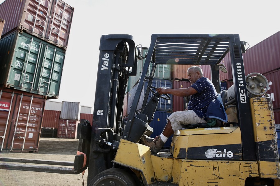 A forklift driver works at the port of Los Angeles, California, the United States, on Oct. 22, 2021. (Xinhua)