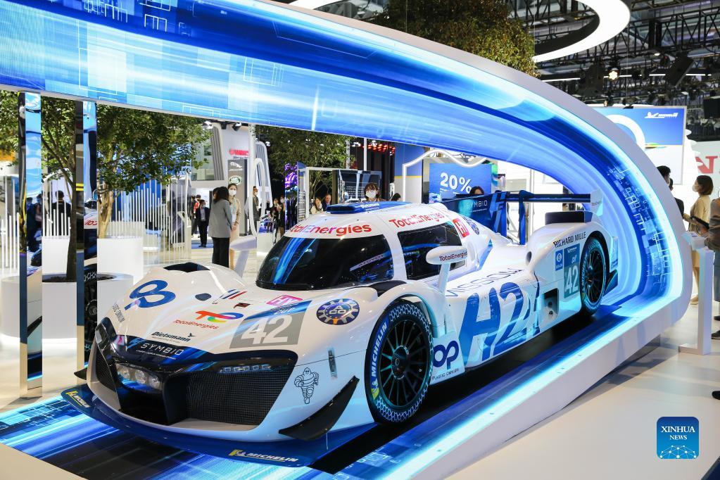 A Michelin new energy race car is displayed at the 4th China International Import Expo (CIIE) in Shanghai, east China, Nov. 5, 2021. (Photo by Hao Zhao/Xinhua)