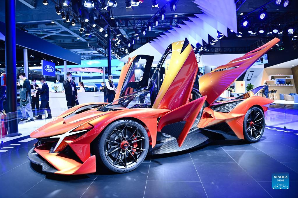 An Apollo new energy race car is displayed at the 4th China International Import Expo (CIIE) in Shanghai, east China, Nov. 5, 2021. (Xinhua/Li Xiang)