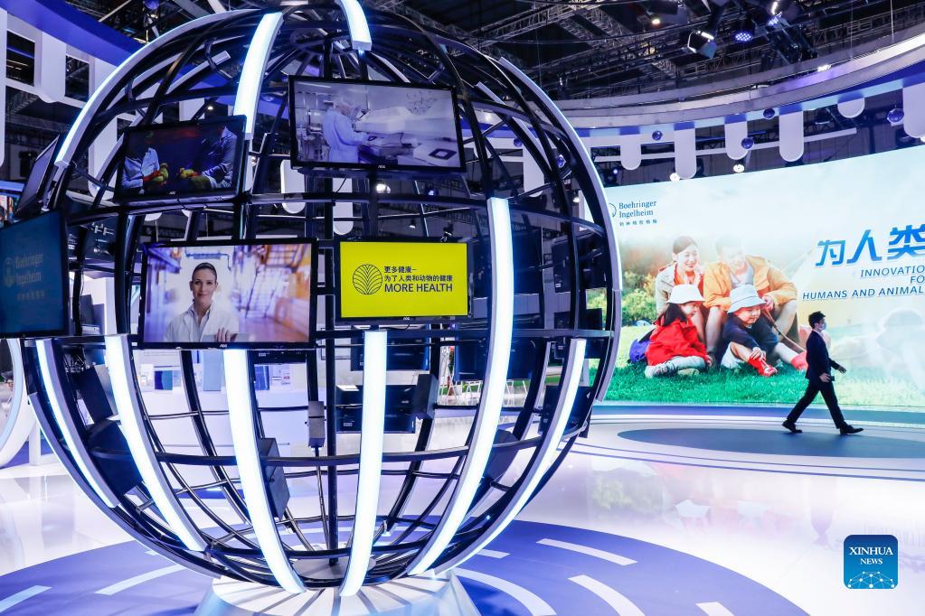 Photo taken on Nov. 7, 2021 shows the booth of Boehringer Ingelheim at the Medical Equipment and Healthcare Products Exhibition Area of the 4th China International Import Expo (CIIE) in east China's Shanghai. (Xinhua/Zhang Yuwei)