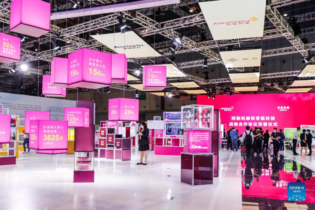Photo taken on Nov. 7, 2021 shows the booth of AstraZeneca at the Medical Equipment and Healthcare Products Exhibition Area of the 4th China International Import Expo (CIIE) in east China's Shanghai. (Xinhua/Zhang Yuwei)