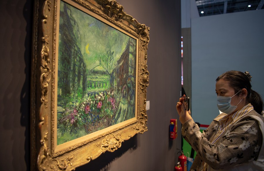 A visitor takes photo of an artwork at the booth of Sotheby's during the 4th China International Import Expo (CIIE) in east China's Shanghai, Nov. 7, 2021. (Xinhua/Wu Huiwo)
