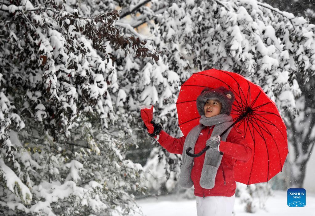 A visitor views the snow scenery at a park in north China's Tianjin, Nov. 7, 2021. The traditional solar term of Lidong, the beginning of winter, fell on Nov. 7 this year. (Xinhua/Zhao Zishuo)