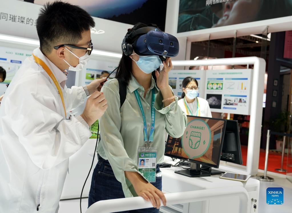 A visitor experiences a virtual reality (VR) device at the Consumer Goods Exhibition Area of the 4th China International Import Expo (CIIE) in east China's Shanghai, Nov. 6, 2021. (Xinhua/Liu Ying)