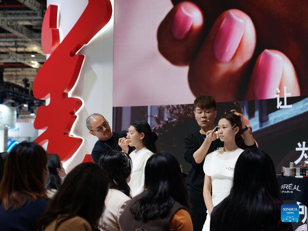 Makeup artists demonstrate makeup products at the Consumer Goods Exhibition Area of the 4th China International Import Expo (CIIE) in east China's Shanghai, Nov. 6, 2021. (Xinhua/Liu Ying)
