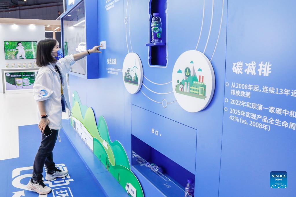 A staff member demonstrates how to use an intelligent plastic bottle recycling machine at the Food and Agricultural Products Exhibition Area of the 4th China International Import Expo (CIIE) in east China's Shanghai, Nov. 6, 2021. The intelligent plastic bottle recycling machine at Danone booth can recycle plastic bottles thrown away by visitors and turns them into soft fabrics. Fabrics made from 16 bottles can make a coat. (Xinhua/Zhang Yuwei)