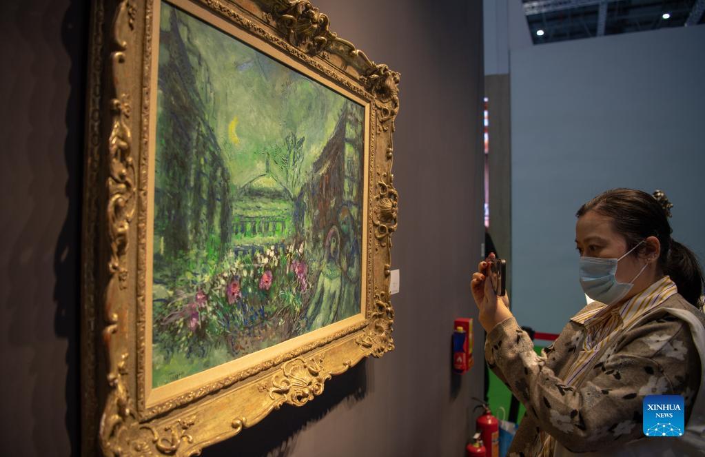 A visitor takes photo of an artwork at the booth of Sotheby's during the 4th China International Import Expo (CIIE) in east China's Shanghai, Nov. 7, 2021. The China International Import Expo (CIIE) has for the first time established a cultural relics and art section. Major auction houses made their debuts at the fourth iteration of the expo in the hope of attracting Chinese collectors. The special section has an exhibition area of more than 1,200 square meters and hosts 178 exhibits with a total estimated value of 2.35 billion yuan (about 367 million U.S. dollars). (Xinhua/Wu Huiwo)