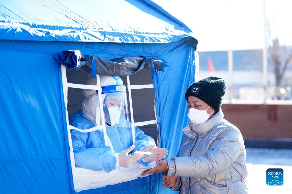 A medical worker prepares to take a swab sample from a resident for nucleic acid testing in Henantun Village of Xingfu Town in Heihe, northeast China's Heilongjiang Province, Nov. 7, 2021. (Xinhua/Wang Song)