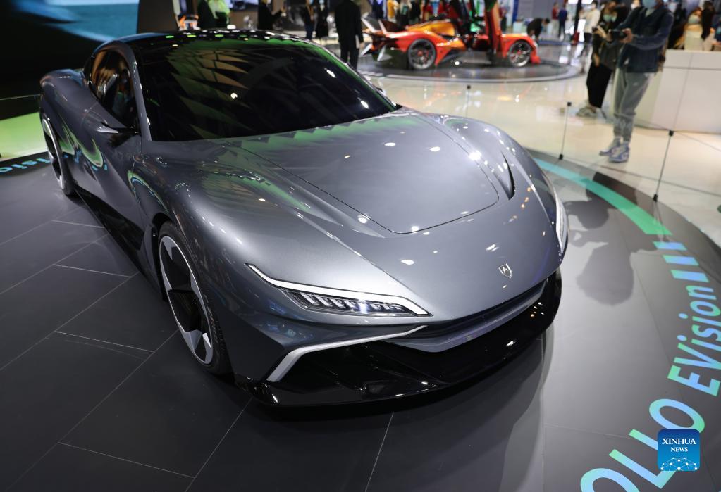 Photo taken on Nov. 7, 2021 shows an Apollo electric sports car displayed at the Automobile Exhibition Area of the 4th China International Import Expo (CIIE) in east China's Shanghai. (Xinhua/Hou Dongtao)