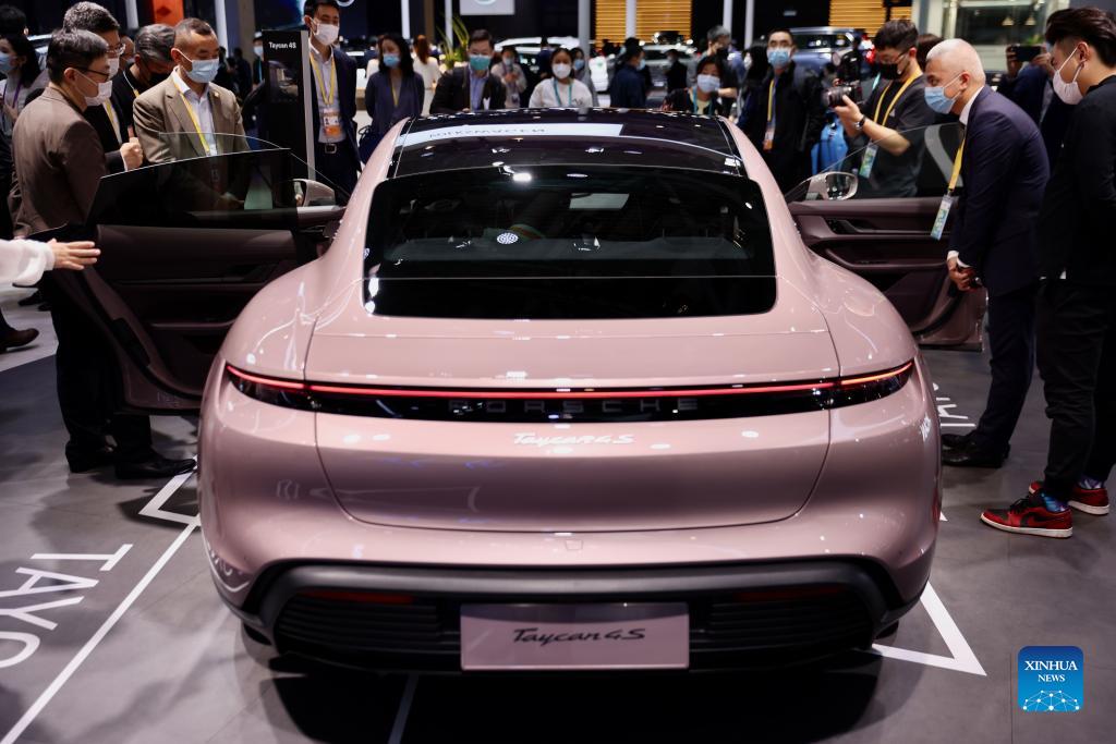Visitors view a Porsche Taycan 4S electric car at the Automobile Exhibition Area of the 4th China International Import Expo (CIIE) in east China's Shanghai, Nov. 7, 2021. (Xinhua/Hou Dongtao)