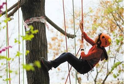 A student climbs a tree at Northwest University in Xi'an, capital of Northwest China's Shaanxi province. (Xi'an Daily/Lei Weidong)
