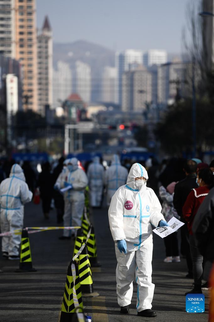 A staff member holds QR codes for citizens to register health information at a testing site in Chengxi District of Xining, northwest China's Qinghai Province, Nov. 8, 2021. Xining started its second round of mass nucleic acid testing at 9 a.m. on Monday. As of Nov. 7, Xining finished the first round of testing, and all swab samples from 1,448,000 citizens came back negative. (Xinhua/Zhang Long)