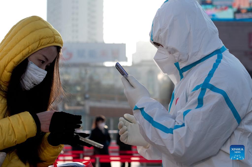 A staff member scans a citizen's health code to check health information at a testing site in Xining, northwest China's Qinghai Province, Nov. 8, 2021. Xining started its second round of mass nucleic acid testing at 9 a.m. on Monday. As of Nov. 7, Xining finished the first round of testing, and all swab samples from 1,448,000 citizens came back negative. (Xinhua/Wu Gang)