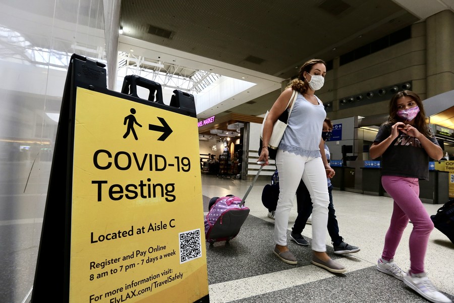 Travelers with face masks are seen at the Los Angeles International Airport in Los Angeles, the United States, July 18, 2021. (Xinhua)