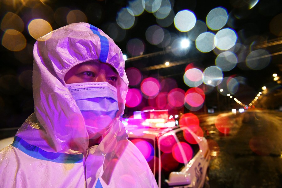 A police officer stands guard in freezing rain in Pingfang District, Harbin, northeast China's Heilongjiang Province, Nov. 8, 2021. (Xinhua/Wang Jianwei)