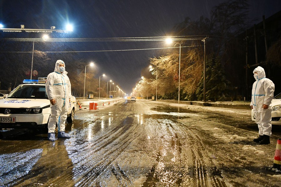 Police officers stand guard in freezing rain in Pingfang District, Harbin, northeast China's Heilongjiang Province, Nov. 8, 2021. (Xinhua/Wang Jianwei)