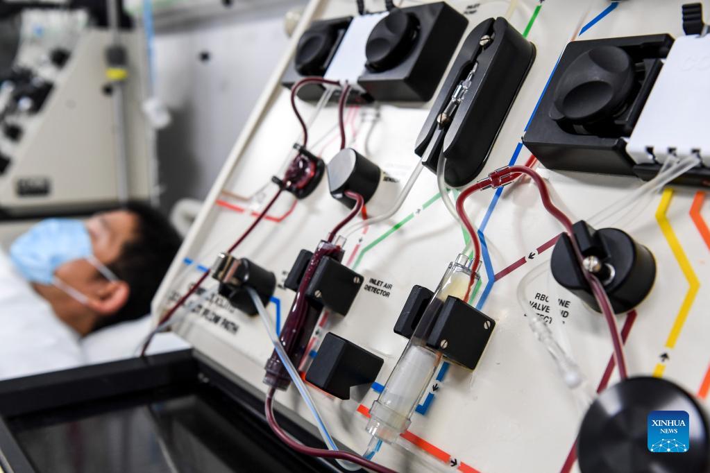 Doctor Li donates his hematopoietic stem cells at the First Affiliated Hospital of Guangxi Medical University in Nanning, south China's Guangxi Zhuang Autonomous Region in November of 2021. Li, a doctor of the hematology department of the First Affiliated Hospital of Guangxi Medical University, registered with China Marrow Donor Program (CMDP) as potential hematopoietic stem cells (HSC) donors in November of 2011. As a doctor providing hematopoietic stem cell treatments for patients, he successfully matches a patient as a HSC donor in August of 2021. Li donated his HSCs recently, which makes him the 12,266th donor of HSC nationally. "It feels good to help someone continue his life," he said. (Xinhua/Cao Yiming)