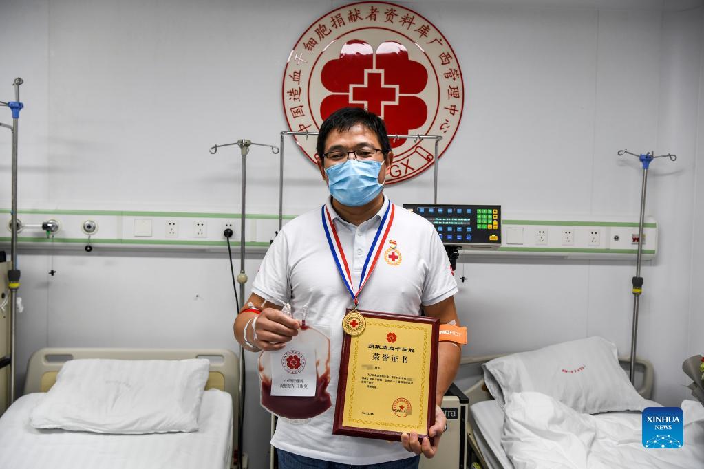 Doctor Li poses for a photo at the First Affiliated Hospital of Guangxi Medical University in Nanning, south China's Guangxi Zhuang Autonomous Region in November of 2021. Li, a doctor of the hematology department of the First Affiliated Hospital of Guangxi Medical University, registered with China Marrow Donor Program (CMDP) as potential hematopoietic stem cells (HSC) donors in November of 2011. As a doctor providing hematopoietic stem cell treatments for patients, he successfully matches a patient as a HSC donor in August of 2021. Li donated his HSCs recently, which makes him the 12,266th donor of HSC nationally. "It feels good to help someone continue his life," he said. (Xinhua/Cao Yiming)