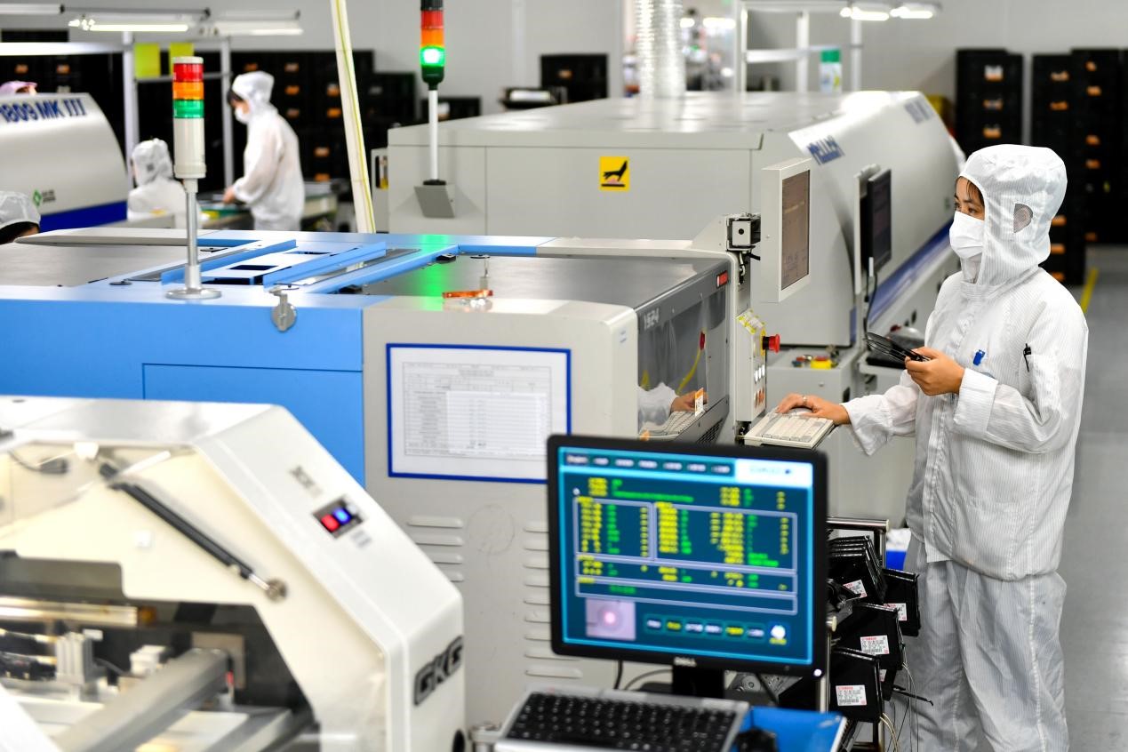 Photo taken on Oct. 14, 2021 shows technicians operating automatic equipment to produce pre-ordered products at the digital workshop of a company based in Huzhou, east China’s Zhejiang province. (People’s Daily Online/Tan Yunfeng)