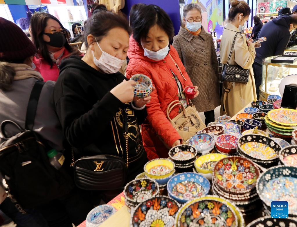 People buy Turkish products while visiting the "CIIE Fair" on the Nanjing Road pedestrian walkway in Shanghai, east China, Nov. 8, 2021. The 4th China International Import Expo (CIIE) is held in Shanghai from Nov. 5 to Nov. 10. (Xinhua/Fang Zhe)