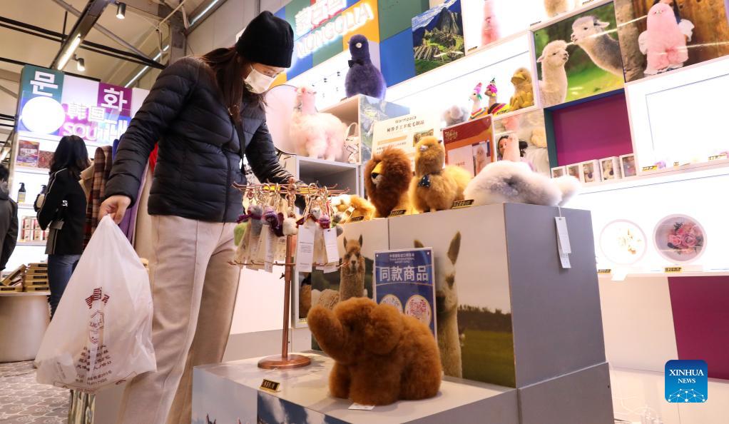 A woman checks a stuffed toy from Peru at the "CIIE Fair" on the Nanjing Road pedestrian walkway in Shanghai, east China, Nov. 8, 2021. The 4th China International Import Expo (CIIE) is held in Shanghai from Nov. 5 to Nov. 10. (Xinhua/Fang Zhe)