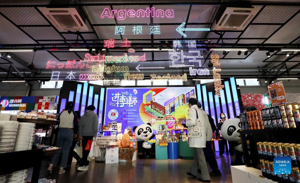 People visit the "CIIE Fair" on the Nanjing Road pedestrian walkway in Shanghai, east China, Nov. 8, 2021. The 4th China International Import Expo (CIIE) is held in Shanghai from Nov. 5 to Nov. 10. (Xinhua/Fang Zhe)
