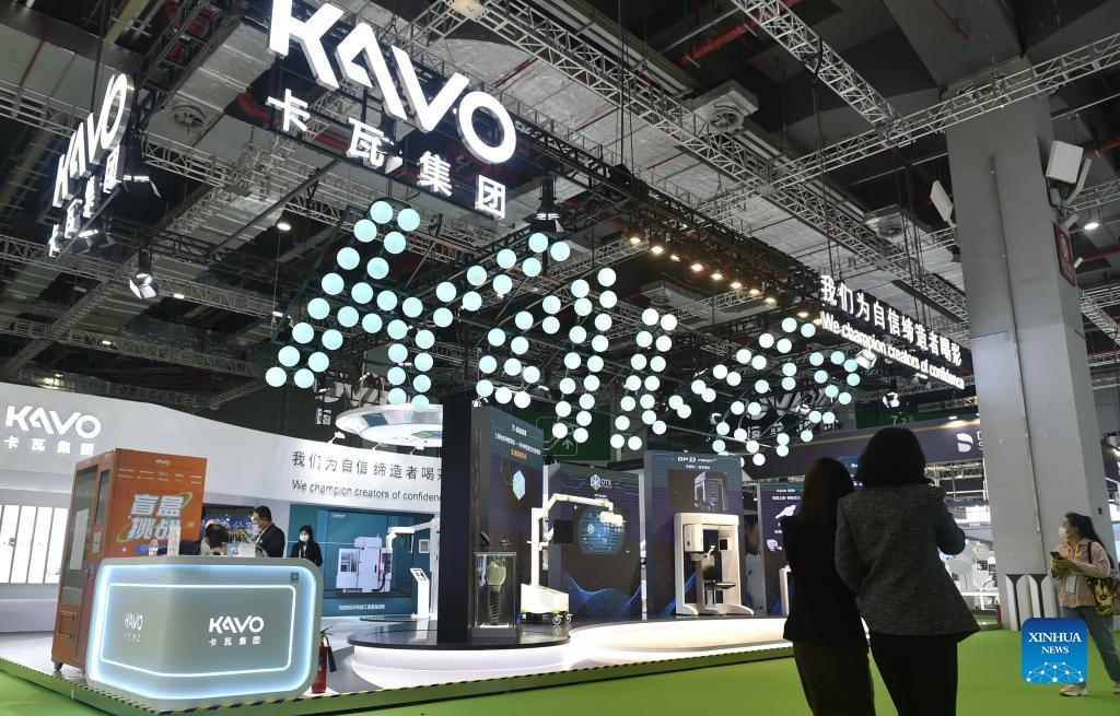 Photo taken on Nov. 8, 2021 shows the booth of KaVo, a dental products manufacturer, during the 4th China International Import Expo (CIIE) in east China's Shanghai. Kavo takes part in the CIIE for the first time. The 4th CIIE kicked off on Nov. 5 and will last till Nov. 10, attracting over 3,000 businesses from 127 countries and regions. (Xinhua/Lu Peng)