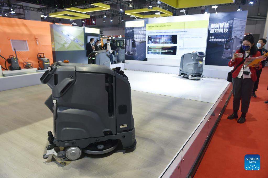 Photo taken on Nov. 6, 2021 shows the booth of cleaning manufacturer Karcher during the 4th China International Import Expo (CIIE) in east China's Shanghai. Karcher takes part in the CIIE for consecutive 4 years. The 4th CIIE kicked off on Nov. 5 and will last till Nov. 10, attracting over 3,000 businesses from 127 countries and regions. (Xinhua/Lu Peng)