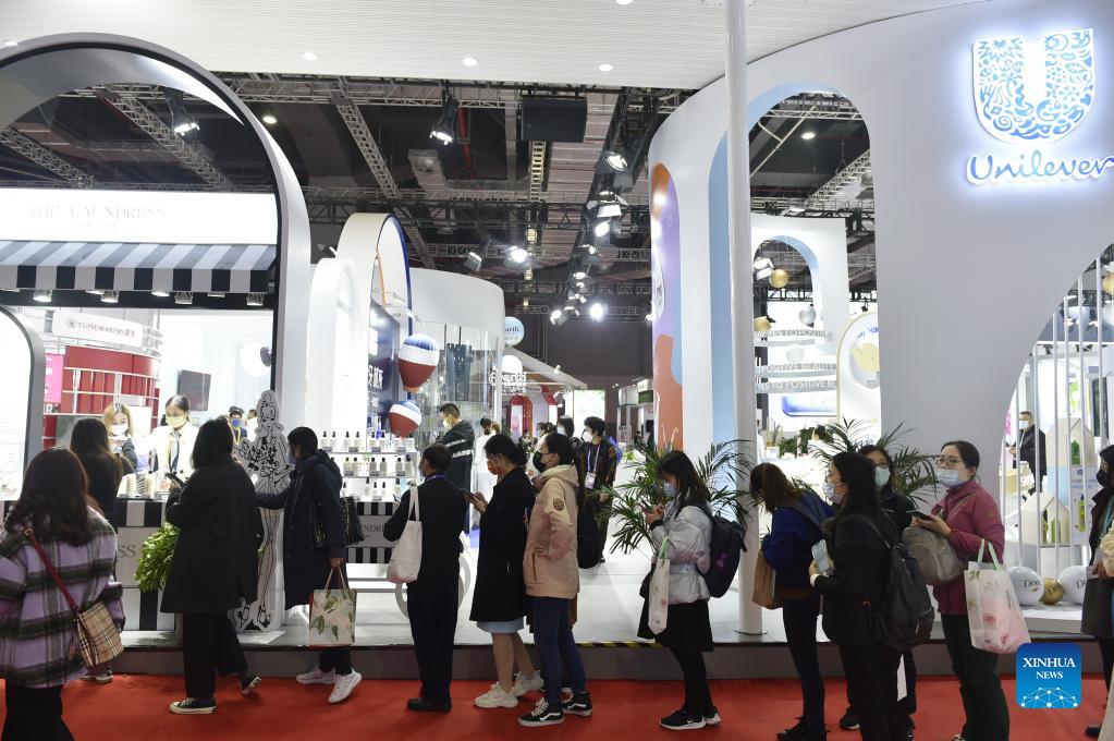 People line up to take part in an event at the booth of Unilever during the 4th China International Import Expo (CIIE) in east China's Shanghai, Nov. 8, 2021. Unilever takes part in the CIIE for consecutive 4 years. The 4th CIIE kicked off on Nov. 5 and will last till Nov. 10, attracting over 3,000 businesses from 127 countries and regions. (Xinhua/Lu Peng)