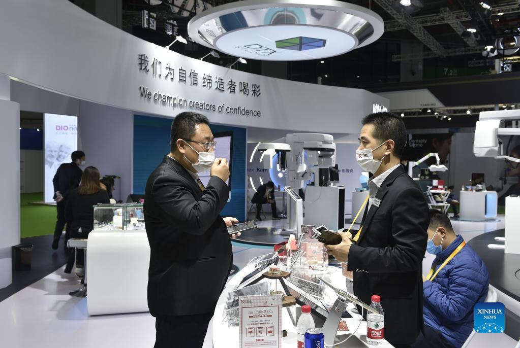 Photo taken on Nov. 8, 2021 shows the booth of KaVo, a dental products manufacturer, during the 4th China International Import Expo (CIIE) in east China's Shanghai. Kavo takes part in the CIIE for the first time. The 4th CIIE kicked off on Nov. 5 and will last till Nov. 10, attracting over 3,000 businesses from 127 countries and regions. (Xinhua/Lu Peng)